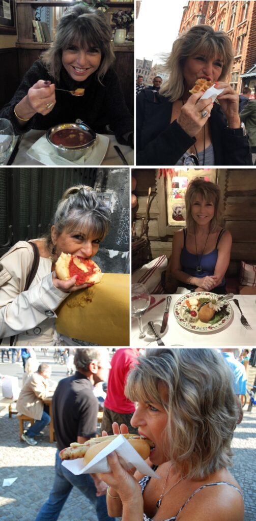 Ann samples food from around the world. (Clockwise from upper right.) A Belian waffle in Belgium, Chicken Kiev in Kiev, a brat in Berlin, pizza in Naples, goulash in Hungary.