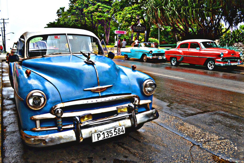 Typical scene of classic American cars parked on Havana streets.