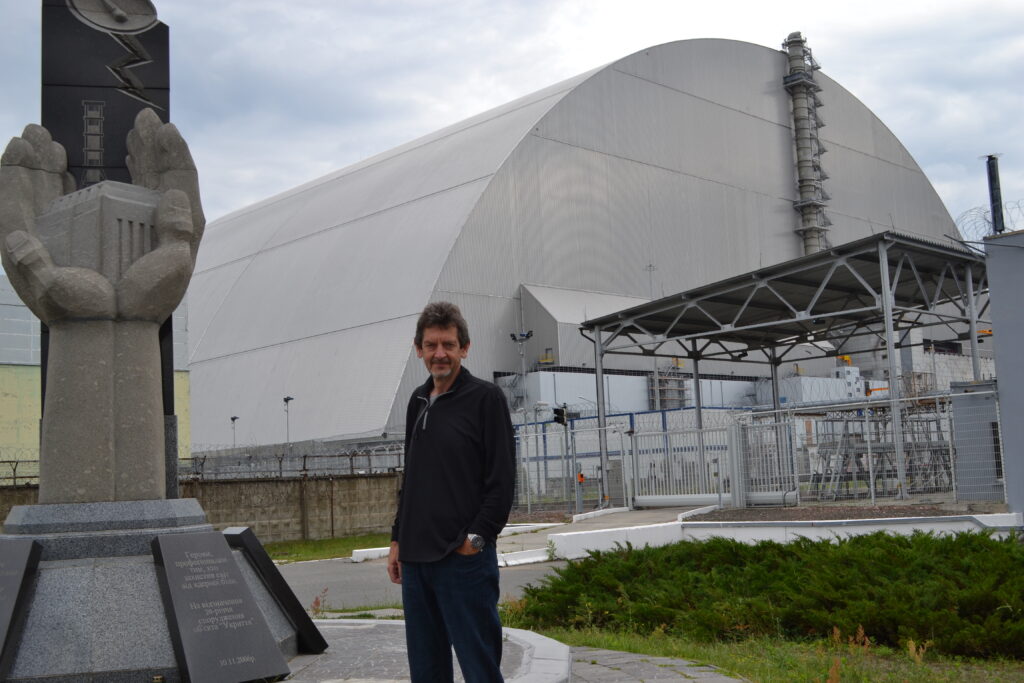 John stands near the New Safe Confinement building that houses the damaged reactor #4 at Chernobyl.