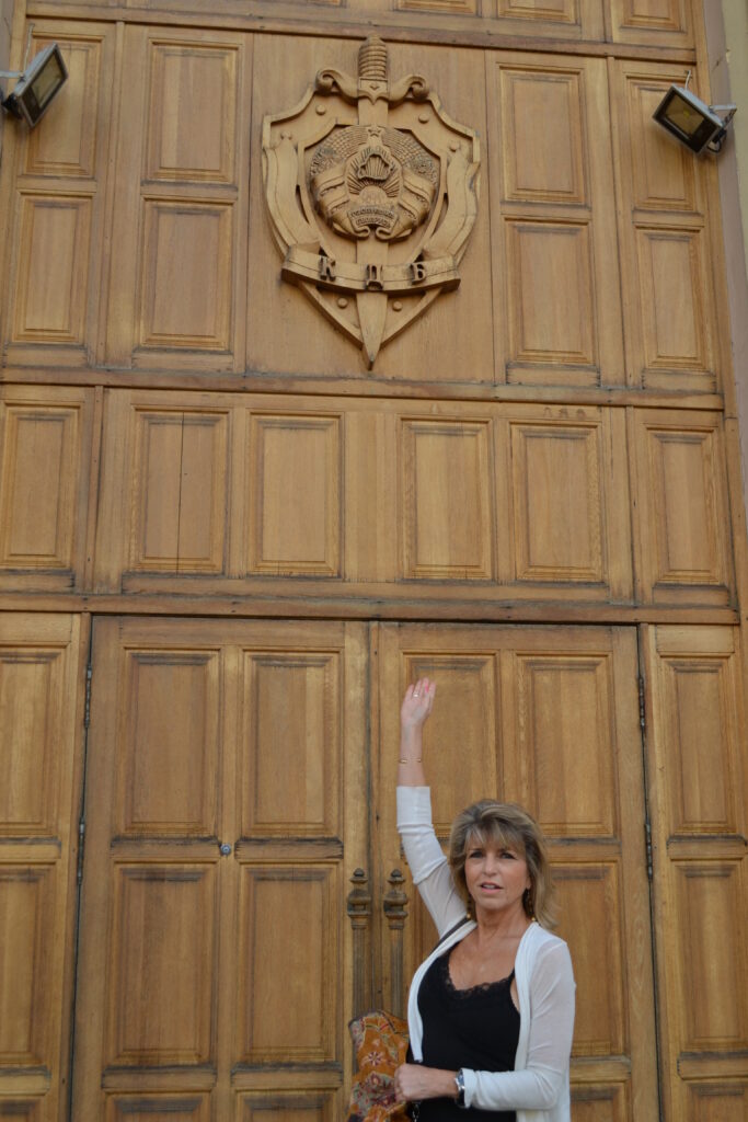 Ann poses in front of the KGB Building in Minsk, Belarus... moments before being shooed away.