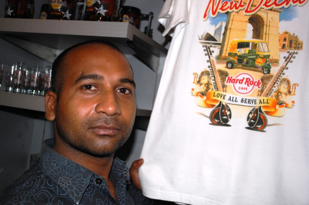 Tuk-tuk driver, Sunny, at the Hard Rock (or 'Hard Find') Cafe in Delhi, India.