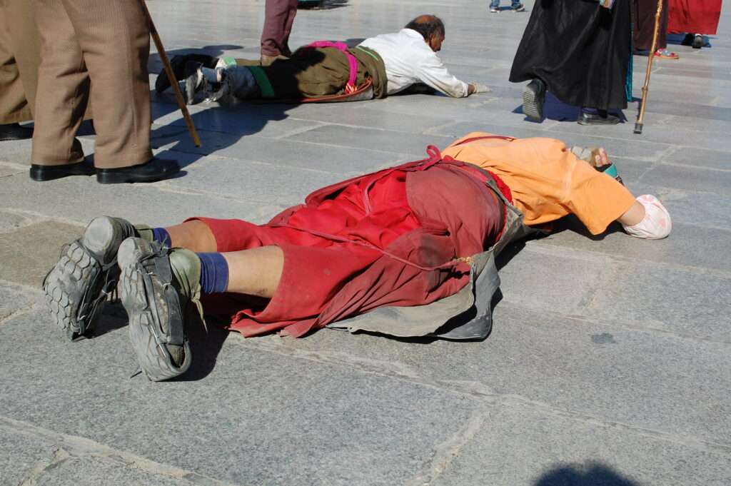 A fervent Buddhist prostrates himself in Lhasa, Tibet.