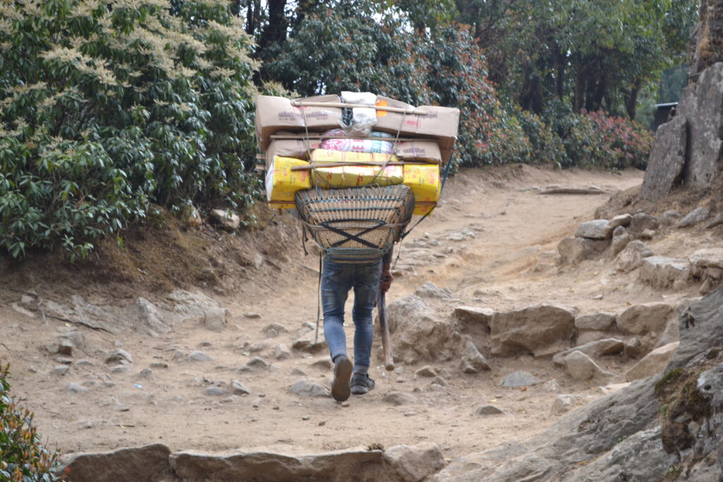 A Sherpa carrying a typical load of supplies on the trail from Lukla to Namche Bazaar.