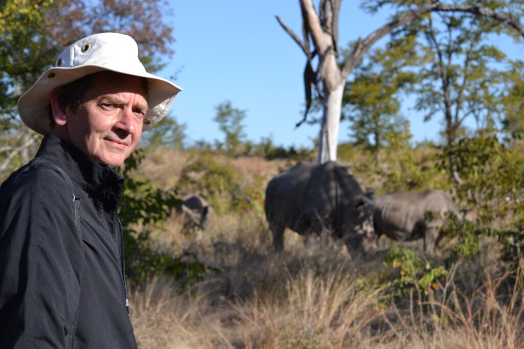 John gets dangerously close to white rhinos during a walking safari in Zambia.