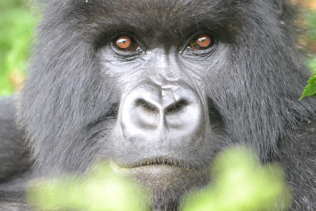 Going eye-to-eye with a mountain gorilla in Rwanda.