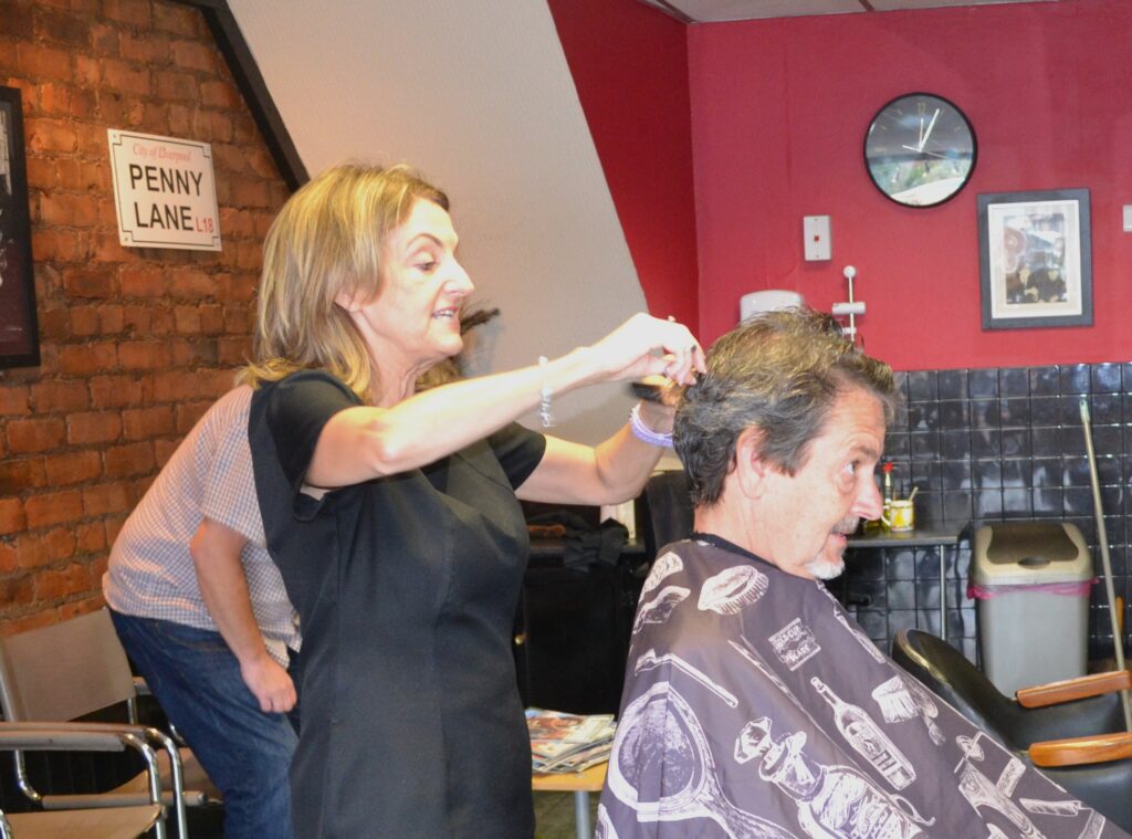 John gets a haircut at the Penny Lane Barber Shop in Liverpool.