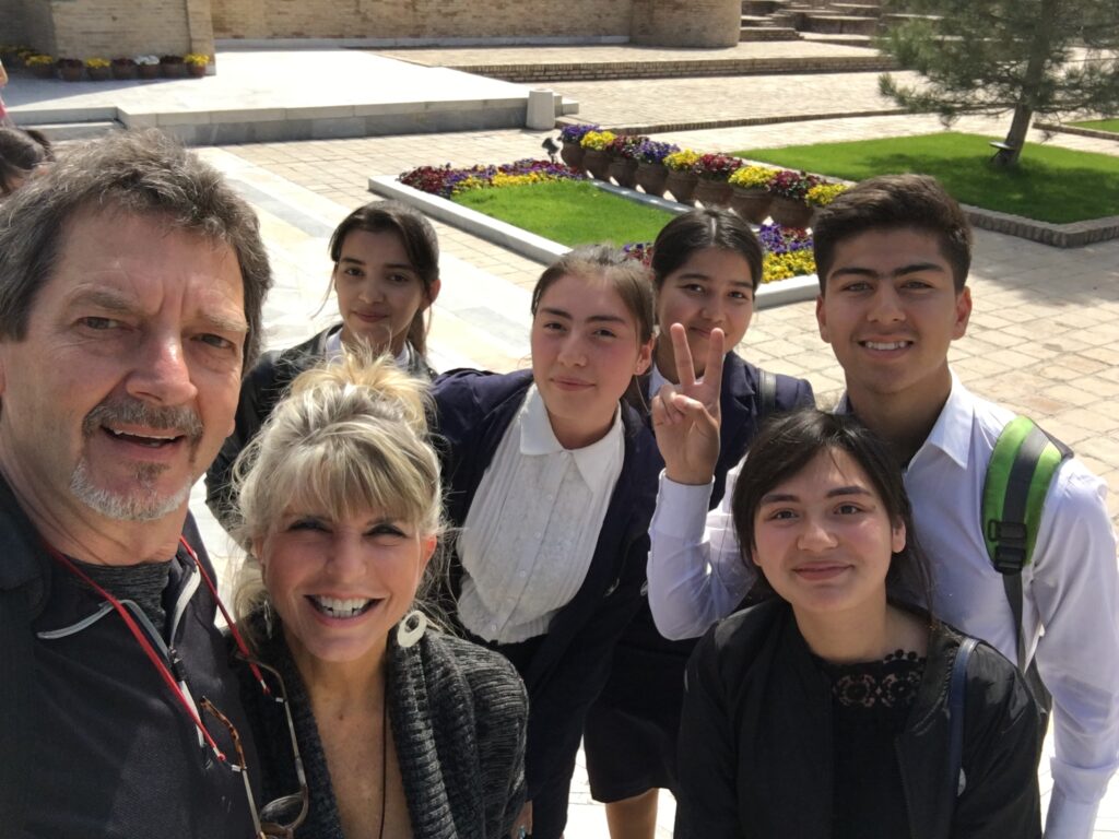 Youths in Samarkand, Uzbekistan practicing their English with the American tourists.