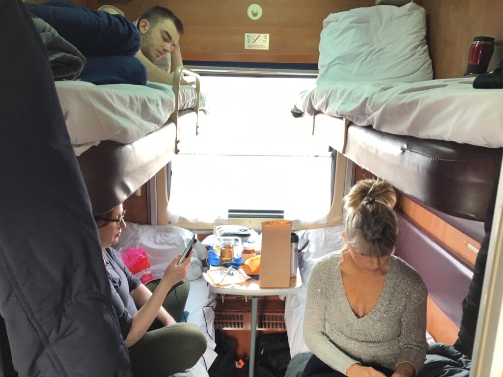 Ann (lower right) and a couple of our roomies in our cozy cabin on the Trans-Siberian Railway.