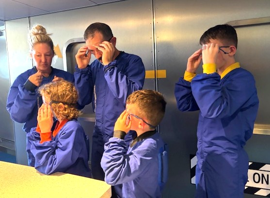 Clay and Nikki's family prepare for the simulated skydiving on the cruise ship.