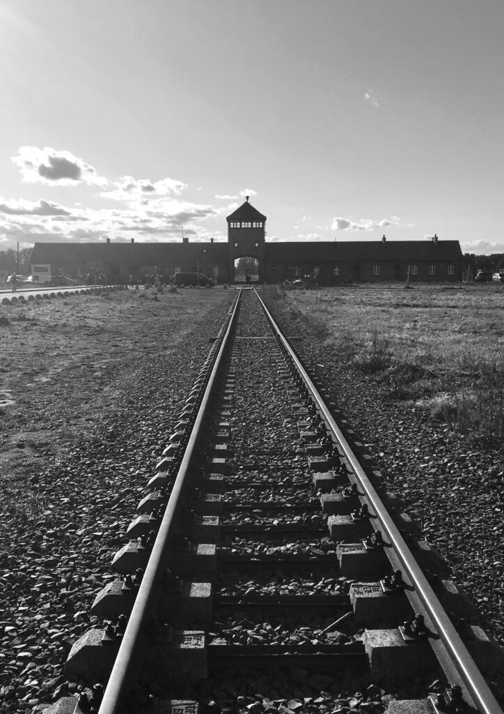Railroad tracks lead to the main gate of the Auschwitz II - Birkenau Concentration Camp in Poland.